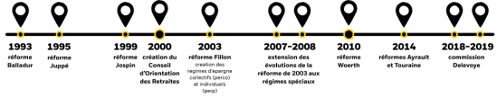 Graphique représentant les 25 ans de réforme des différents piliers du système des retraites en France