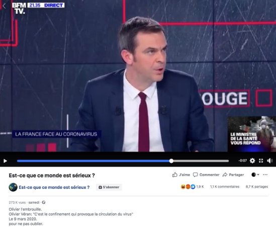 La vidéo a été publiée le 11 avril sur Facebook, « pour ne pas oublier ». Une interview d’Olivier Véran a suscité de nombreux commentaires sur les réseaux sociaux. Cette vidéo est extraite d’une interview du ministre réalisée par BFM-TV le 9 mars. Le ministre de la santé y affirme que « c’est le confinement qui provoque la circulation du virus ».
