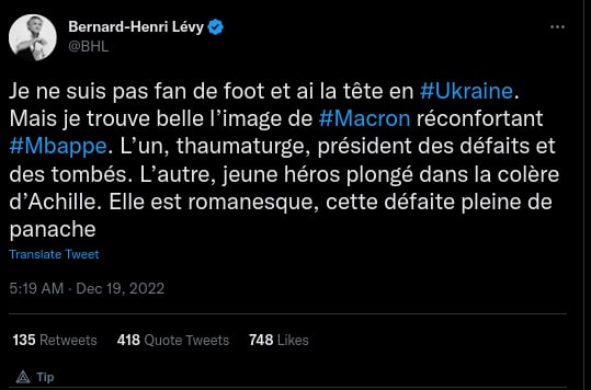 Quel acteur ce Macron, il console Kylian Mbappé sur le terrain, tripote Didier Deschamps dans les vestiaires et s’approprie la discussion de la défaite de la France en finale du mondial de football du Qatar.