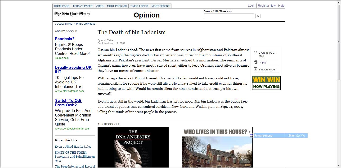 Le seul bémol à cette belle histoire est qu’OBL serait mort et enterré depuis décembre 2001. Et ce ne sont pas de vils conspirationnistes ou l’infâme Thierry Meyssan qui le disent mais Fox News à l’époque du décès putatif [4] et le New York Times six ans plus tard, en juillet 2007. Mais également des ténors de l’armée américaine, l’ex président pakistanais Mucharraf, les services de renseignements israéliens qui tous en chœur déclarèrent que Ben Laden sous dialyse avait été emporté par une affection rénale incurable. Ce qui serait somme toute logique pour un homme âprement traqué, épuisé, de surcroît hypertendu et diabétique.