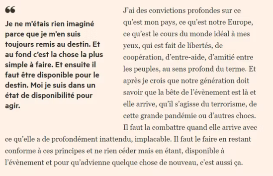 « Je crois que notre génération doit savoir que la Bête de l’évènement est là, elle arrive, qu’il s’agisse du terrorisme, de cette grande pandémie ou d’autres chocs. Il faut la combattre quand elle arrive avec ce qu’elle a de profondément inattendu, implacable. »