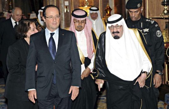 À la mi-juin, il devenait officiel que le prince Bandar fournissait aux insurgés syriens « des armes antichars et antiaériennes, en particulier des missiles portatifs sol-air, provenant pour l’essentiel de fournisseurs français et belges, les frais de port étant pris en charge par la France » [Reuters17juin13]. Ce qui expliquerait que Paris, au-delà de la défense désintéressée des droits de l’homme, ait tout intérêt à une prolongation voire à une extension d’un conflit qui offre de juteux débouchés à son industrie d’armement. D’où également le lien fort qui unit à cette heure les deux capitales partisanes de la guerre à outrance, Riyad et Paris, celle-ci devenue une plaque tournante pour les ministres wahhabites qui s’y succèdent à un rythme soutenu afin de plaider auprès des Européens l’instauration d’une zone d’interdiction aérienne, le renforcement et l’accélération des fournitures d’armes aux rebelles [8].