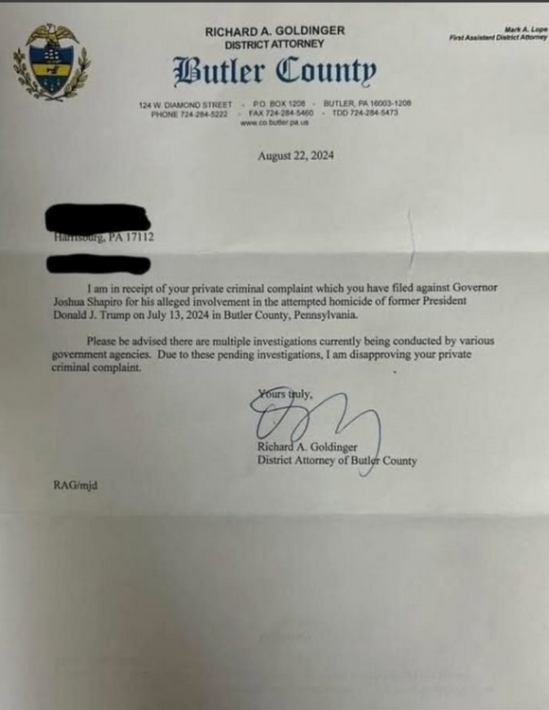 Malgré la gravité des allégations, le procureur du comté de Butler, Richard Goldinger, a refusé de donner suite à la plainte pénale privée de Feinberg. Dans une lettre datée du 22 août 2024, Goldinger a accusé réception de la plainte, mais a invoqué les enquêtes en cours menées par diverses agences gouvernementales pour justifier sa désapprobation.