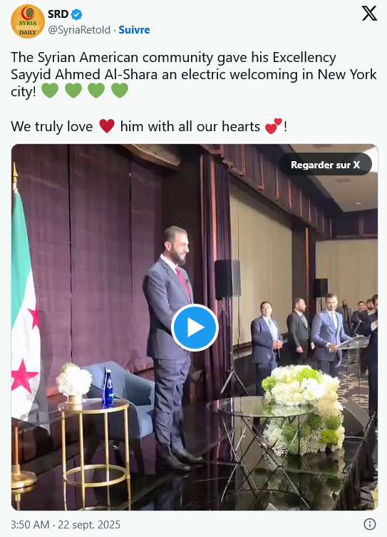 Sharaa est actuellement en déplacement à New York où il prendra la parole à la tribune de l’Assemblée générale des Nations unies, mardi. Il sera ainsi le premier dirigeant syrien à s’exprimer devant les membres de l’Assemblée depuis six décennies.