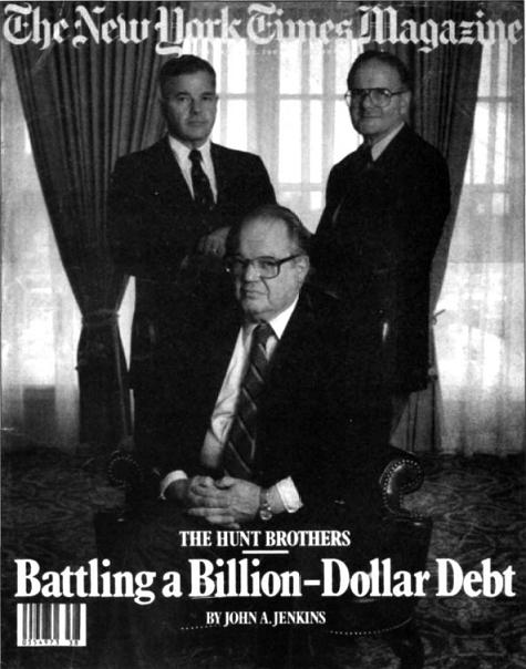 · Au milieu des années 1970, le bruit commence à courir que les frères Hunt ont entrepris de faire un « corner » sur le marché de l’argent. L’opération consiste à manipuler le marché dans le but d’obliger les vendeurs à liquider leurs positions et ce, à n’importe quel prix s’il le faut. De fait, à partir du milieu des années 1970, les frères Hunt commencent à accumuler les contrats sur l’argent afin de contraindre les vendeurs à leur céder leurs stocks. Comme s’il fallait s’y attendre, la manœuvre entraîne une hausse rapide des cours de l’argent : alors qu’en 1973 il cotait 1,95 dollar l’once, il en vaut près de 4 au début de l’année 1975. Pour racheter le stock encore disponible sur le marché, Nelson Bunker et William Herbert doivent donc se préparer à dépenser près de 2 milliards de dollars. Une somme énorme, même si les deux Texans peuvent compter sur l’héritage de leur père, récemment décédé, et sur leurs très florissantes affaires pétrolières. C’est autant pour répartir les risques financiers que pour accélérer leurs acquisitions de métal précieux qu’ils décident de faire appel à des partenaires.