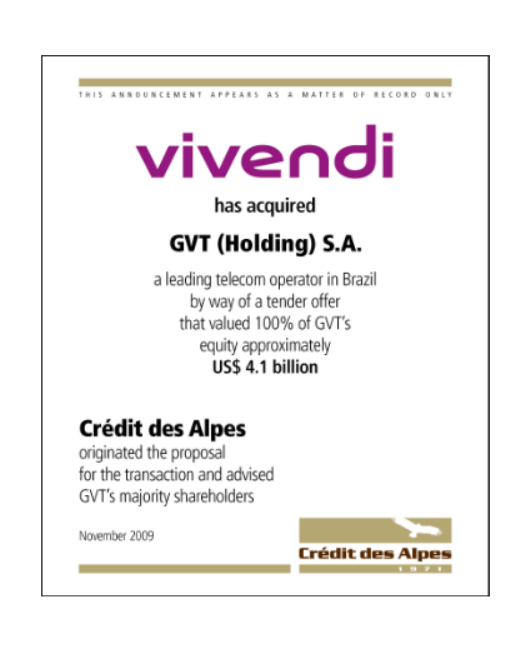 Cerina a fusionné et développé l’entreprise pour en faire Crédit des Alpes, une banque d’investissement qui conseille sur les grandes transactions internationales. La banque a orchestré l’acquisition par Vivendi (VIV:FP)[7] de la société brésilienne GVT, leader du marché du haut débit, pour un montant de 4,2 milliards de dollars américains en 2009, ce qui constituait alors la plus grande transaction mondiale dans le domaine des télécommunications.