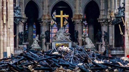 Sous la voûte perforée, dans les flammèches qui illuminent la nef dévastée et la luminescence du plomb en fusion tombant goutte à goutte, le reflet de l’incendie éclaire, derrière le maître autel, la piéta de Notre-Dame. Elle est intacte. Sculptée par Nicolas Coustou à la demande de Louis XIV suivant le vœu de son père Louis XIII, sur les genoux de la Vierge éplorée repose le corps du Christ qui vient d’être descendu de la Croix. À gauche, Louis XIII offre sa couronne et son sceptre ; à droite Louis XIV est en prière. À présent la toiture ayant disparue (dont la masse ajoutée à celle de la charpente assurait la cohésion de l’édifice), la nef, le transept et le chœur sont vulnérables, exposés qu’ils sont au risque d’une chute plus large de la voûte : pour trois parties vitales de la structure (outre la voûte elle-même), à savoir le pignon du transept nord et celui situé entre les deux tours, l’éventualité d’un effondrement n’est pas encore totalement écartée. Rien n’est donc encore fini.