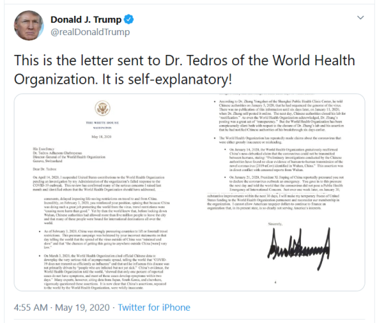 Le 18 mai 2020, le président Donald Trump a écrit au directeur général de l’Organisation Mondiale de la Santé, le Dr Tedros Adhanom Ghebreyesus. Dans cette lettre, le président Trump fait état des résultats d’une étude que son administration a menée sur la réponse de l’OMS à la pandémie de Covid-19. Le président Trump a écrit que « nous savons ce qui suit » et la première allégation qu’il a faite est que l’OMS « a constamment ignoré des rapports crédibles sur la propagation du virus à Wuhan au début de décembre 2019 ou même avant, y compris des rapports du journal médical Lancet. L’Organisation Mondiale de la Santé n’a pas mené d’enquête indépendante sur les rapports crédibles qui étaient en conflit direct avec les comptes rendus officiels du gouvernement chinois, même ceux qui provenaient de sources situées à Wuhan même ».