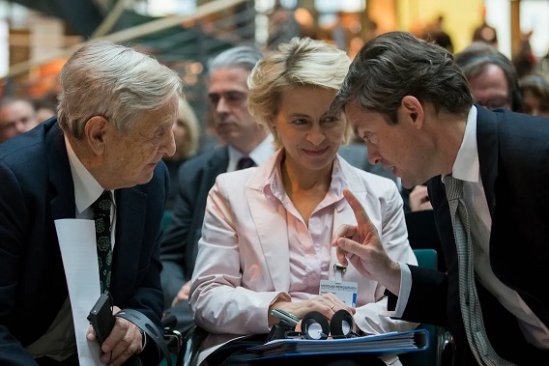Nicolas Berggruen (à droite), converse avec Ursula von der Leyen (au centre) et George Soros (à gauche), le 30 octobre 2012 à Berlin. © AFP / THOMAS PETER / POOL