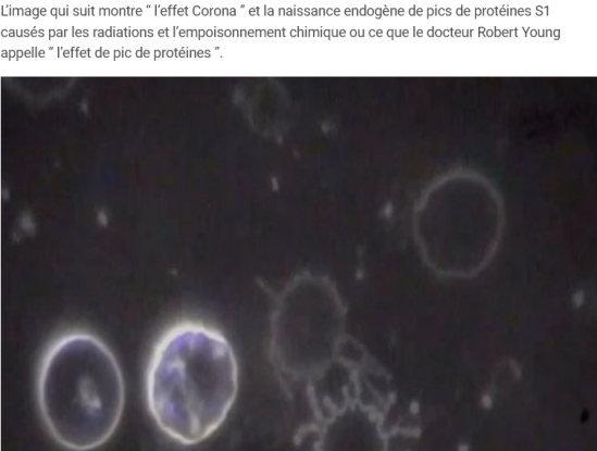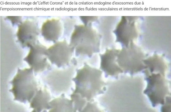 La micrographie ci-dessus montre la création endogène des “pics de protéines” comme une infection. Les images précédentes montrent “L’EFFET CORONA” sur les globules rouges montre “L’EFFET PROTÉINE SPIKE”, tous deux causés par une acidose décompensée des fluides interstitiels et vasculaires provenant d’un mode de vie acide et plus particulièrement d’une exposition à des champs électromagnétiques pulsés toxiques à 2,4 GHz ou plus, d’un empoisonnement chimique provenant de la nourriture et de l’eau ingérées, d’une pollution atmosphérique acide toxique, de chemtrails et, pour couronner le tout, d’une inoculation de CoV-19 à base de nano particules chargées de produits chimiques !