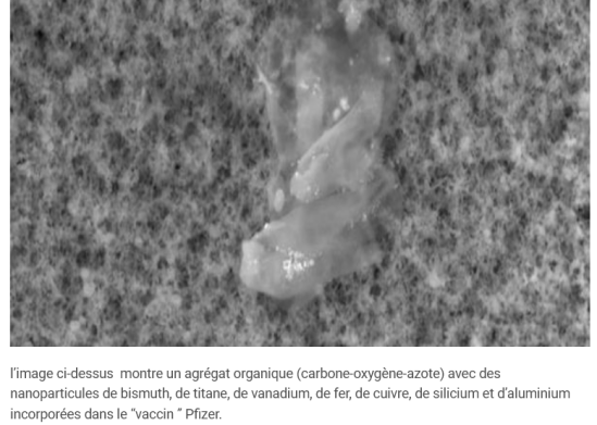 L’image ci-dessus montre les particules de taille nanométrique et micronique identifiées dans le “vaccin ” Pfizer. La particule blanche de 2 microns de long est composée de bismuth, carbone, oxygène, aluminium, sodium, cuivre et azote.
