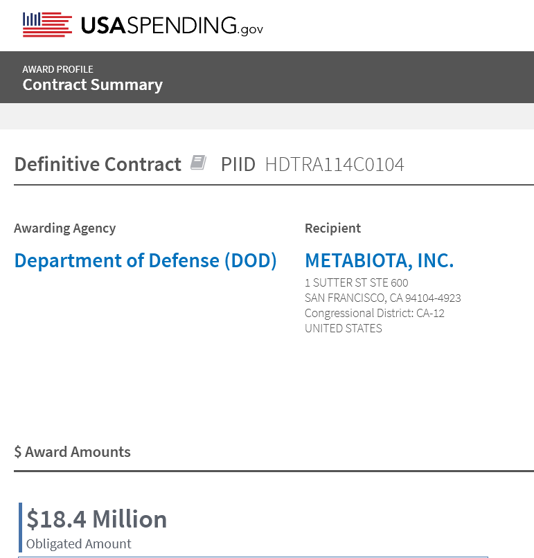 Metabiota est soutenue par Google Ventures et In-Q-Tel de la communauté du renseignement des États-Unis (CIA). Ils ont signé des accords stratégiques avec Metabiota en 2017.
