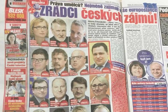 « Traîtres aux intérêts tchèques ». Le 29 mars, le tabloïd Blesk s’en prend aux eurodéputés qui ont voté contre la directive droits d’auteurs. BLESK