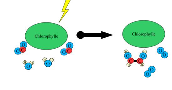 ⦁ la fixation du carbone présent dans l’air sous forme de dioxyde de carbone (CO2) et sa transformation en molécules complexes (sucre, cellulose...) ;