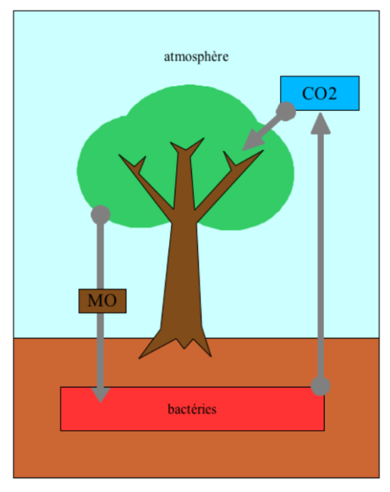 carbone et destruction de la matière organique. C’est là que la notion de « cycle » trouve ses limites, dans la mesure où elle semble évoquer une mobilisation permanente du carbone. En fait, le « cycle » se déroule entre deux masses de stock : le carbone minéral de l’atmosphère mobilisé par la photosynthèse et le carbone organique stocké dans le sol.