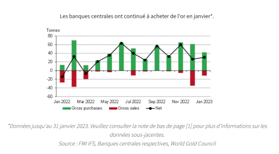 La demande d’or des banques centrales en 2023 a repris au même rythme qu’en 2022. En janvier, les banques centrales ont collectivement ajouté 31 tonnes (t) nettes aux réserves d’or mondiales (+16% sur un mois) [1]. Ce chiffre se situe également confortablement dans la fourchette de 20 à 60 t d’achats déclarés en vigueur au cours des 10 derniers mois consécutifs d’achats nets.