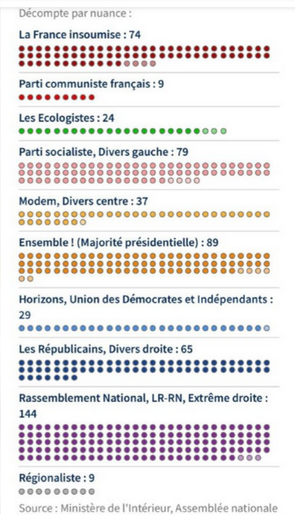 Le statu quo est l’absence de changement, le maintien d’une situation actuelle. Du point de vue des résultats de ces législatives il n’y a pas de majorité et le pouvoir en place est maintenu. Les anciens socialistes seront pour Macron, et LFI devra s’y soumettre pour goutter l’ivresse du pouvoir. La dissolution et la peur du RN représente la préférence pour l’état actuel des choses face aux changements.