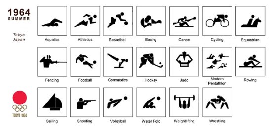 Les Jeux Olympiques de Tokyo en 1964 inaugurent ainsi une signalétique imagée qui permet au monde entier de retrouver son chemin en fonction des épreuves.
