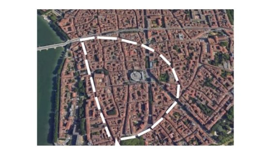 L’examen attentif de la photographie aérienne de Toulouse révèle l’enceinte médiévale dans le tracé actuel de la voirie des boulevards. Ce tracé est dû pour partie à la destruction des remparts et pour partie à la conservation des rues ‘ escoussières ‘ rues qui permettaient d’acheminer rapidement les troupes sur les points attaqués et qui sont demeurées après la démolition des remparts. Pour les mêmes raisons, on distingue assez clairement le tracé de l’enceinte romaine dans le plan de la ville qu’elle enserre sur 90 Ha.