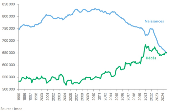 C’est un graphique particulièrement parlant : en cette année 2025, pour la première fois depuis la Seconde Guerre mondiale, les courbes des naissances et des décès vont se croiser, et il y aura certainement dès l’an prochain davantage de décès que de naissances en France. Autrement dit, si l’on ne tient pas compte du solde migratoire, la population du pays va diminuer.