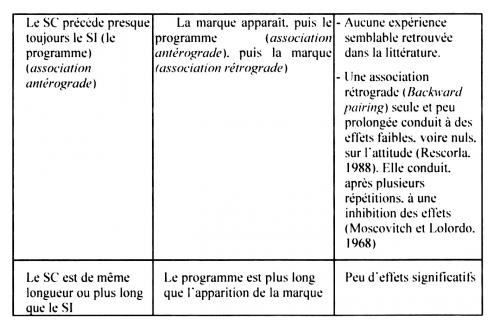Pour tester différentes modalités d’impact du conditionnement classique, l’expérience initiale a subi de multiples modifications, notamment dans le cadre de la recherche en marketing et en communication. Ainsi, le conditionnement antérograde (SC précède SI) semble plus efficace que le conditionnement rétrograde (SI précède SC) [3]. Les publicités les plus efficaces seraient donc celles qui citent d’abord la marque (SC) avant d’évoquer les attributs positifs qui lui sont associés (SI). Certaines recherches se sont penchées également sur l’inhibition latente. Le concept de conditionnement classique est traditionnellement mobilisé pour expliquer la formation d’attitudes (aucun jugement initial ni représentation n’existe sur l’objet social) et, si l’on transfère le mécanisme aux marques, il ne serait valable que dans le cas de marques nouvelles. En effet, il y a une inhibition latente, ou en d’autres termes un retard du conditionnement classique, quand la marque (SC) a déjà été présentée aux consommateurs avant qu’elle ne soit, lors d’une campagne publicitaire, associée à des SI de valence positive. Il convient de préciser que la nouveauté du SI joue également un rôle dans la contingence positive [4].