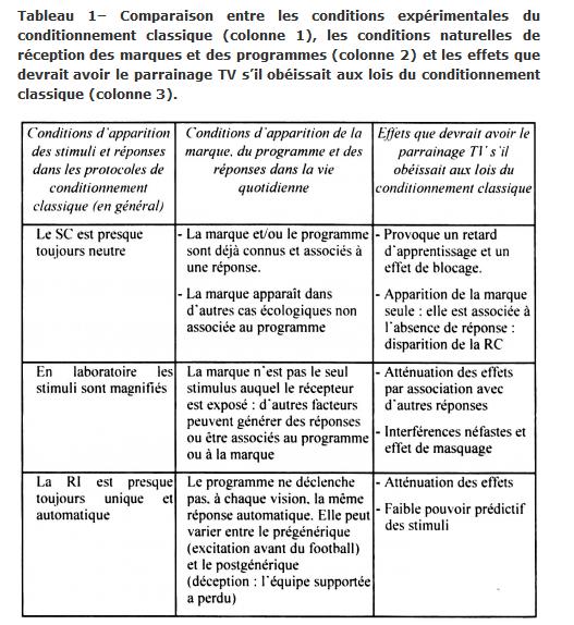Les modalités d’apparition de la marque et du programme sont loin de correspondre aux modalités d’apparition des stimuli dans les protocoles de conditionnement classique. La troisième colonne du tableau montre que si le parrainage TV suivait réellement les lois des protocoles de conditionnement classique, ses effets seraient quasi nuls !